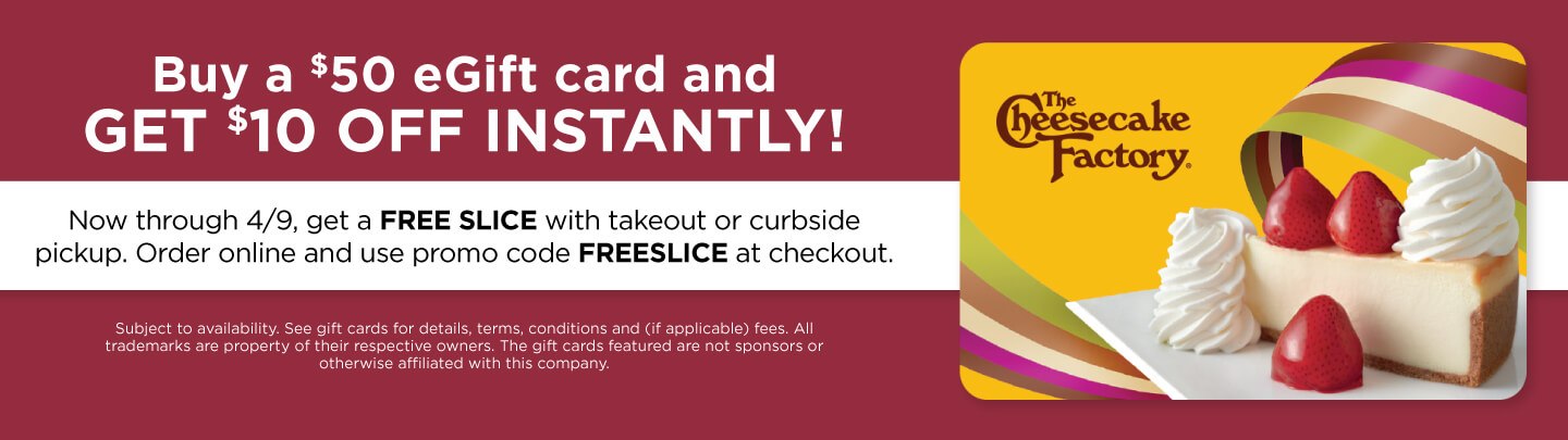 Kroger is offering $10 off a $50 The Cheesecake Factory eGift card thru Apr 09, 2020